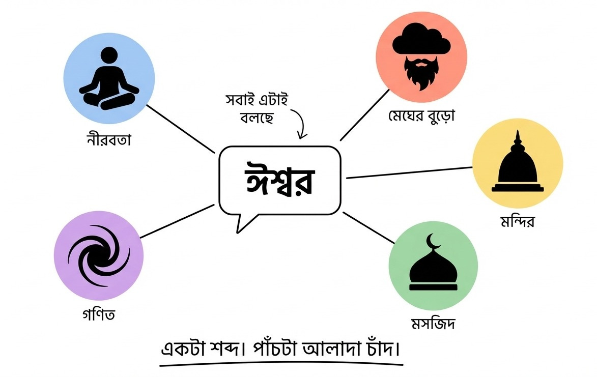 আমি যখন “ঈশ্বর” বলব, তোমার পুরনো ছবি মাথায় আনো না। দেখো আমি কোন দিকে দেখাচ্ছি। হয়তো আলাদা দিক। হয়তো তোমার জানা দিকই। কিন্তু আগে দেখো।