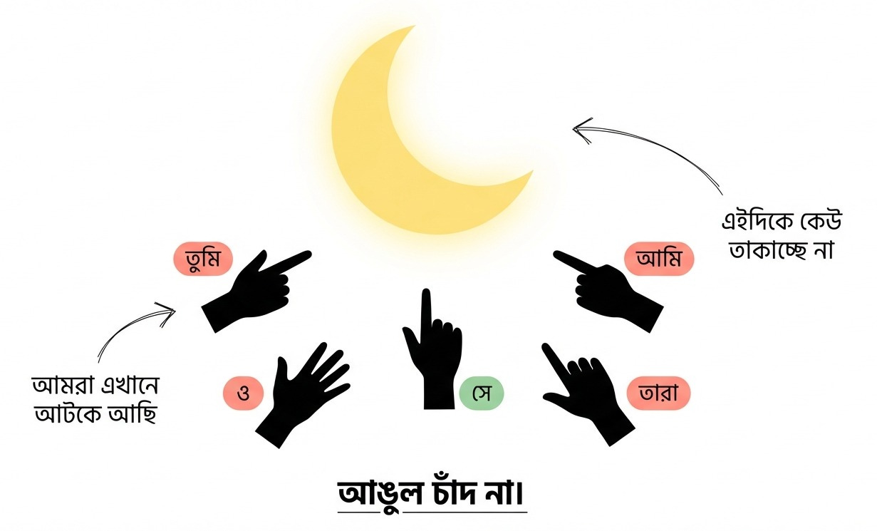 তুমি যদি আঙুলের দিকে তাকিয়ে থাকো, চাঁদ কোনোদিন দেখা হবে না। আঙুল তো শুধু দেখাচ্ছে। আসল জিনিস আছে ওইখানে, আঙুল যেদিকে পয়েন্ট করছে সেদিকে।