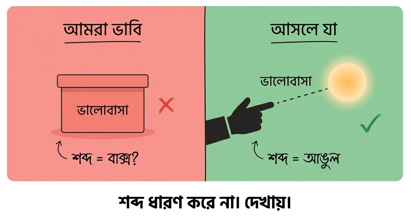 সোজা কথায়: শব্দ ধারণ করে না, দেখায়। দুজন একই শব্দ বলে আলাদা জিনিস দেখাতে পারে। বেশিরভাগ তর্ক এই কারণে অর্থহীন। থামো, জিজ্ঞেস করো, দেখো কোনদিকে আঙুল যাচ্ছে।